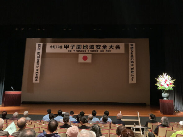 令和7年度甲子園地域安全大会鳴尾文化ホールで開催の、令和7年度甲子園地域安全大会に参加しました。 甲子園防犯協会長と甲子園警察署長の主催者挨拶のあと、功労者表彰が行われ、来賓祝辞、講話、大会宣言、吹奏演奏と続いて閉会しました。 特殊詐欺、自転車安全…続きを読む
