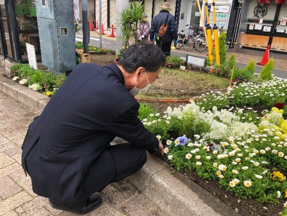 甲子園口の花壇今朝は、JR甲子園口駅前の花壇活動されている「花さかせ隊」の皆さんとの会話に花が咲きました。 暖かくなり花壇の花々も活き活きと咲き始め、駅前の雰囲気が明るくなっております。 桜も満開で、春到来となりました。