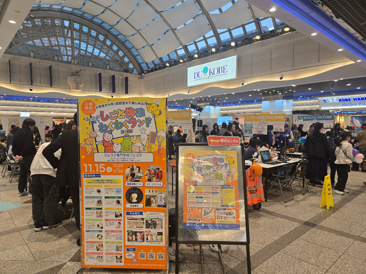 JR神戸駅の地下、デュオ神戸で「ひょうご専門学校フェスタ~しごと体験わくわくランド~」が開催されました。小学生から高校生までを対象に、職業体験を通じ、様々な職業の認識を深めるイベントです。