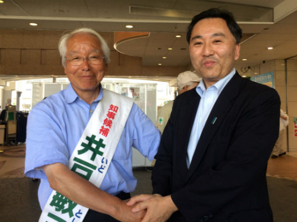残すところあと2日知事選挙も残すところあと2日、本日は西宮市に来られたので応援に駆けつけました。兵庫県下の各地を廻り、熱く政策を訴えてきた知事候補は真っ黒に日焼けし、エネルギーに溢れる姿は精悍でした。